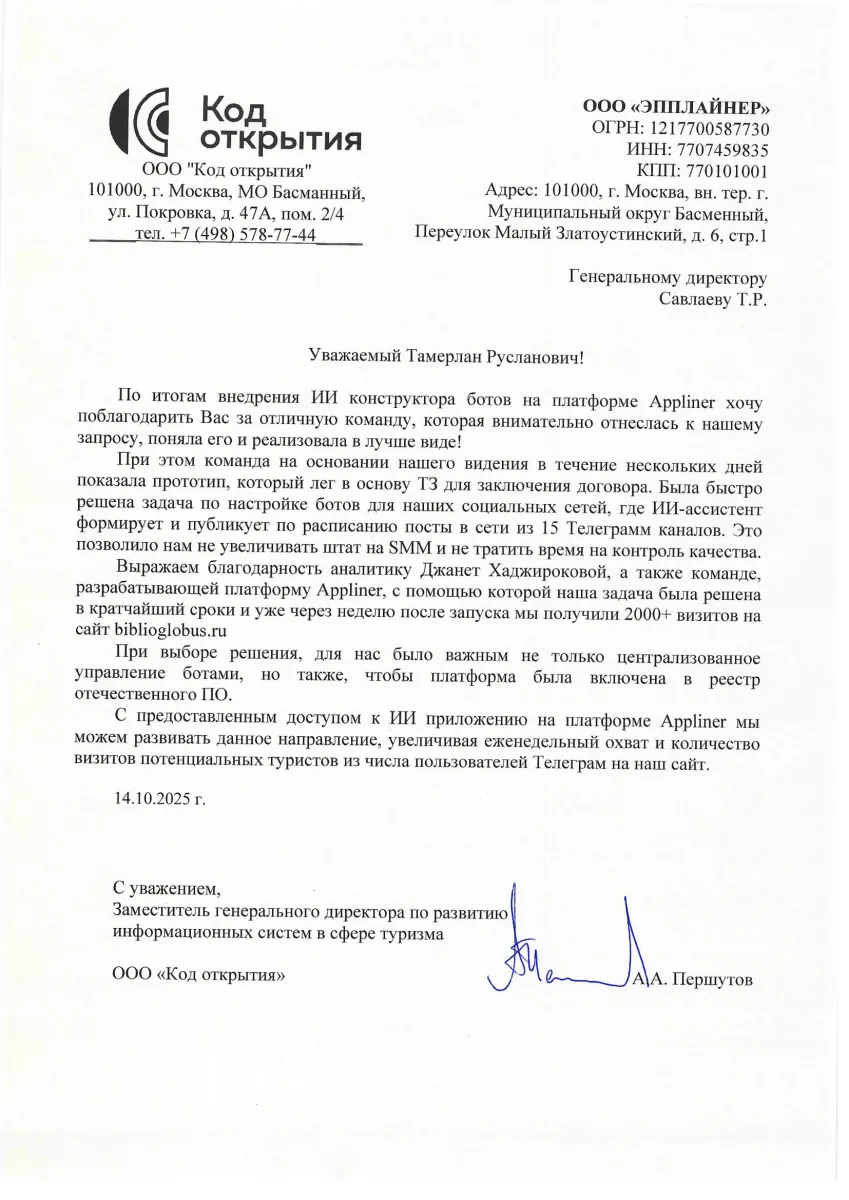 Москва, 1 ноября 2025 — ООО «ЭППЛАЙНЕР» сообщает об успешном завершении внедрения ИИ-ассистента для онлайн-турагентства. Проект позволил компании «Код Открытия» в кратчайшие сроки автоматизировать ведение корпоративных Telegram каналов и увеличить посещаемость сайта biblioglobus.ru